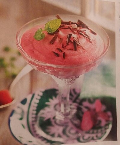 Здесь будет описан рецепт самого вкусного десерта на свете. Время-30 мин Персоны-4 Калорий-280 Необходимо взять: 500 гр замороженных красных фруктов 1 ст.л желатина 120 гр сахара 100 мл сметаны 2 яичных белка 50 гр черного шоколада 4 листочка мяты Приготовление: Размороженные фрукты положить в миксер и взбивать 1-2 минуты, пропустить через ситечко для удаления семечек. Желатин замочить в 1/2 стакана холодной воды для набухания. Белки взбить с 1/2 сахара 2-3 минуты. В сметану добавить 1/2 сахара и мешать до растворения сахара. Фрукты,желатин,взбитые яйца и сметану хорошенько перемешать, разложить по порциям,украсить натертым шоколадом,листочком мяты , убрать на 3 часа в холодильник. Приятного аппетита!