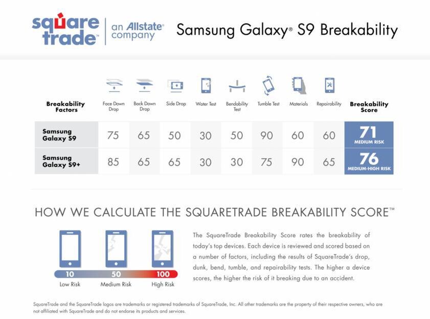 С нами уже 96 человек! Делись с друзьями, подписывайся на наш канал и жми лайк, чтобы не пропустить новые публикации. В настоящее время страховые компании вынуждены проводить crash-тесты не только для проверки автомобилей, но и на современных смартфонах, производители которых анонсируют их повышенную прочность, и совсем недавно были протестированы новые аппараты от Samsung Galaxy S9 и S9+. На этот раз тест проводила известная в широких кругах страховая компания SqareTrade, используя в эксперименте самые популярные флагманы последнего времени Samsung Galaxy S9 и S9+. В итоге специалисты привели отчет, в котором было указано, что устройства корейской компании сбрасывались с большой высоты, топились в воде и разбирались на мельчайшие детали, после чего им были присвоены баллы: 71 для Samsung Galaxy S9 76 - для Samsung Galaxy S9+ примечательно, что чем более высок этот показатель, тем ниже прочность устройства. И несмотря на то, что качественным такой результат не назовешь, он