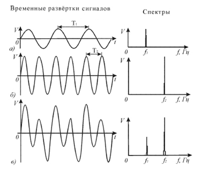 В математике есть такой термин синусоида. А в электронике этому понятию можно сопоставить слово - гармоника. Гармоника - это переменный ток (сигнал) в виде чистой синусоиды. Как мы уже рассматривали, с точки зрения происхождения электричества - переменный ток или переменное напряжение может получатся путем генерации (от генератора) или трансформации (через трансформатор). Так же есть понятие как генерация сигнала,в данном случае - это может быть сигнал от датчика, голосовой сигнал, обратная связь с фильтра. Данный сигнал тоже переменный (иначе смысл его исследовать или усиливать, если он всегда один и тот же и мы его знаем заранее) В электронике и электросвязи тоже, принято рассматривать переменный сигнал с точки зрения гармоник. А именно если посмотреть на рисунок а) видим, что слева диаграмма синусоиды,а с права её частотное представление. Тут нам важны два параметра - это амплитуда сигнала (переменное напряжение) и период синусоиды (время через которая она начинает повторяться).
