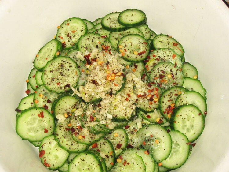 Простой рецепт очень вкусного и остренького салата. Ингредиенты: Огурцы - 5 шт. Чеснок - 5 зуб. Кунжут - 2 ч.л. Перец красный - 1шт. Растительное масло - 100 мл. Соль - 0,5 ч.л. Соевый соус - по вкусу (примерно 1 ч.л.) Перец (черный молотый) - по вкусу Приготовление: Огурчики нарезаем тоненькими кружочками. Добавляем чеснок, пропущенный через чеснокодавку, соль, кунжут, соевый соус. Стручок красного перца освобождаем от семян, мелко режем и добавляем к огурчикам. Растительное масло сильно раскаляем на сковороде и заливаем им салат. Салат мешаем и отправляем в холодильник на 1 час настояться и пропитаться. Вуаля! Чудесный остренький салат готов! Приятного аппетита! ЖИТЬ НАДО ВКУСНО! Спасибо за лайк и подписку! Добро пожаловать на канал "Мужчина на кухне"!