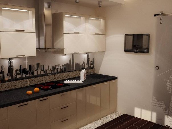 Благородный серый цвет в интерьере кухни Благодаря правильному сочетанию серых оттенков, интерьер кухни не смотрится холодным и безликим. Глянцевая поверхность кухонных рядов различается на один тон, такой вариант оформления передает плавность цветовых переходов. Над электрической варочной плитой располагается вытяжка стильной формы, которая по своему дизайну сочетается с интерьером серой кухни. Напольное покрытие и часть стены контрастно выделяются на фоне светлых красок. Деревянные оттенки добавляют теплоты и природной живости в интерьер серой кухни. Помещение кухни оснащено качественным локальным освещением, которое должным образом выполняет как эстетическую, так и практичную функцию. Кухонный фартук украшен изображением с небоскребами, которое реалистично передает ощущение черно-белой фотографии. Подсветка шкафов при необходимости обеспечивает светлую рабочую поверхность. Композиция искусственно камина превосходно создает благоприятную атмосферу для семейной трапезы. Вос
