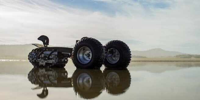 Компания Flux Design Co из Сиэтла запускает в продажу новый тип транспортного средства: доску-внедорожник Track 1. Аппарат без труда везет взрослого человека по снегу, песку, жидкой грязи, щебенке и прочему офф-роаду. Силовая установка у Track 1 полностью электрическая, двигатель имеет мощность 5 л.с., а аккумуляторы для оперативной замены сделаны быстросъемными. На одной зарядке, сообразно тяжести поставленной задачи, машина проезжает от 13 до 24 км. Этот комбинированный колесно-гусеничный агрегат сопоставим по размерам с модным электро-самокатом, однако он оказывает такое давление на грунт, будто стоит на больших 76-сантиметровых колесах. И поэтому не проваливается в грязь. Управление Track 1 дистанционное, но входить в повороты ему лучше помогать наклонами тела. Благо, в нем предусмотрено крепление для ног, а широкая гусеница позволяет резко тормозить или двигаться по склону, не сползая. Разработчики говорят, что он может преодолевать 50-градусный уклон, но только с одним пассажиром