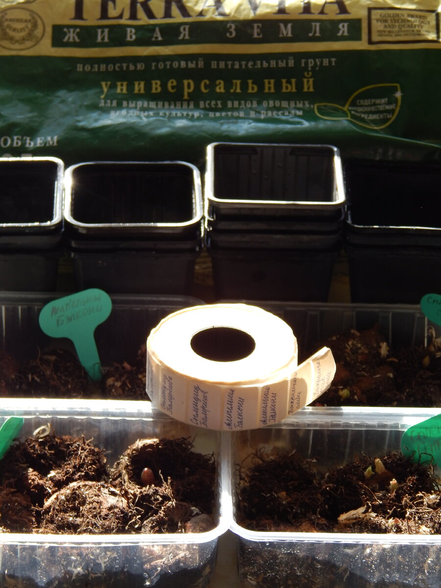 Я планировала сразу посадить пророщенные клубни бегоний в кашпо и вынести их в теплицу. Как это правильно сделать, очень подробно и с прекрасными фото описано в теме Посадка проросших клубней бегонии в горшки и вазоны форума "Дачный ответ Галактики". Но зима, никак не желающая покидать нас в этом году, внесла свои коррективы. У меня нет возможности держать сразу 20 кашпо дома две-три недели, пока погода наладится, а между тем большая часть моих клубней бегоний проросла на 1-1,5 сантиметра, на некоторых листочки вот-вот начнут раскрываться. Я решила пойти своим путём и высадить клубни сначала в рассадники, ведь они займут гораздо меньше места. Вот что я подготовила для дальнейшей работы: Сначала я заполнила рассадники грунтом "Терра Вита" немного больше, чем наполовину. В каждый опустила клубень бегонии, прикрепив заранее этикетку с названием сорта. Об этикетках и других маркерах я давала информацию в статье Полезные мелочи для цветовода или как лучше маркировать рассаду. Затем очен
