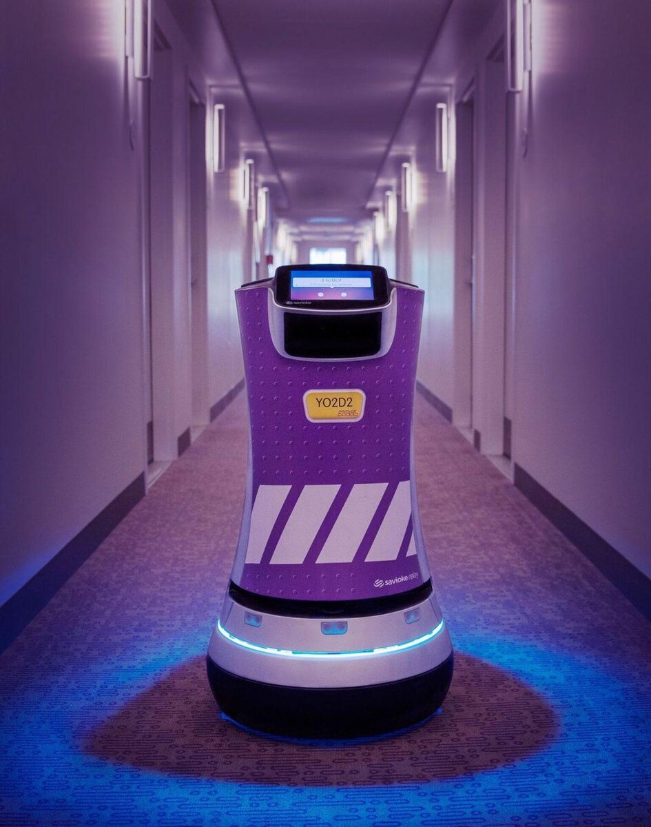 В холле бостонского отеля Yotel можно увидеть 36-дюймового робота, похожего на R2D2. Изначально он задумывался как электронный ассистент, который будет только встречать и провожать гостей, оказывая им информационные услуги. Затем его функции расширили: теперь он выполняет функции консьержа, обеспечивая постояльцев необходимыми мелочами. Порой люди забывают взять в дорогу какие-то вещи, или оказываются без них из-за потери багажа. Также выдаваемых ежедневно в отеле предметов гигиены может не хватить. Самый быстрый способ вернуть привычный комфорт – сообщить о своих потребностях консьержу. Он соберёт для вас всё необходимое и доставит в номер. Часто запрашиваемые предметы обычно уже есть в отеле, а в бостонском Yotel их доставляет робот. Получив очередной запрос, YO2D2 отображает его на экране и открывает свой транспортный отсек. Персонал отеля помещает в него требуемые вещи, и робот отправляется на доставку. Он знает карту отеля лучше персонала и умеет самостоятельно пользоваться лиф