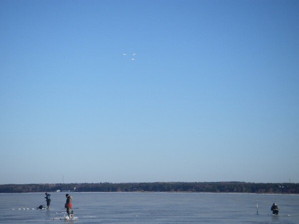 Вот и птички прилетели, гуси...хоть и плохо их видно на фото) Это на заливе нашел остатки льда . И на нем рыбаков, в количестве 27 человек. Значит безопасно) Не я один попрусь... Хотя вчера лед оторвало, но в полтора км. от берега, а припой остался... Под берегом лед тоже плохой, но там по колено глубины...