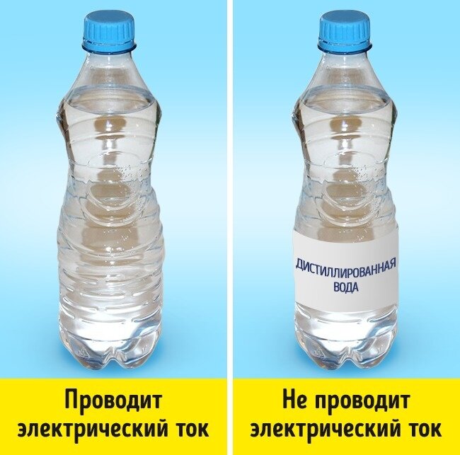 На самом деле: электричество проводят растворенные в воде минералы с положительно и отрицательно заряженными частицами, а сами по себе молекулы воды заряда не имеют. Поэтому дистиллированная вода из-за отсутствия в ней примесей электричество не проводит.