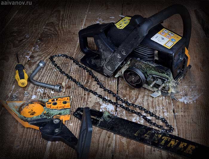 Бензопилу нужно регулярно чистить. После очередного использования, бензопила засоряется намного сильнее, чем любой другой инструмент. Опилки вместе с древесной пылью замешанные на масле для цепей – создают смесь, которую не так просто очистить. Сделать это, частично не разобрав пилу, проблематично. Оставшийся бензин лучше слить. А если после чистки долгое время не планируете пользоваться пилой, то следует её снова завести и на холостых оборотах дать выработаться бензину, оставшемуся в карбюраторе. Так мотор будет лучше сохранятся. Затем выключить пилу и отвинтив две гайки снять защитную крышку (с блокиратором цепи). После этого легко снимается шина и цепь (цепь ставится таким образом, чтобы режущие звенья находились по ходу её движения, если вы с этим не слишком хорошо знакомы, запомните, как это должно выглядеть). Для грубой чистки удобна проволока или тонкая отвертка лопаткой. Так удобнее сковыривать большие наслоения грязи. Затем чистка продолжается кисточкой с сравнительно жесткой