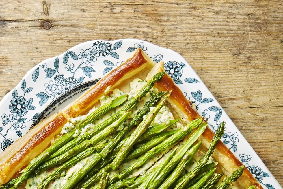 Этот несладкий овощной пирог является основным гарниром. Ингредиенты 1 лист замороженного слоеного теста, разморозить 1 большое яйцо 1 стакан сыра рикотта соль перец 1 лимон 2 зеленый лук, мелко нарезанный 1/4 стакана свежей петрушки, нарезанной 1 ст. свежий эстрагон(тархун), рубленый 350 грамм спаржи, порезать пополам 1/2 стакана оливкового масла Способ приготовления 1. Нагрейте духовку до 220°с; поместите противень в нижней трети духовки. Разложите тесто на листе пергаментной бумаги и раскатать до толщины в 1 сантиметр со всех сторон. Перелаживаем пергамент и тесто на противень. В средней миске, взбейте яйцо. Слегка смажьте 1 сантиметровую границу вокруг теста яйцом. 2. Добавить рикотту и по 1/4 чайной ложки соли и перца в миску с оставшимся яйцом. Мелко натрите цедру лимона в миску, вмешайте зеленый лук и зелень. Выкладывать на тесто, оставляя границы которые заранее смазали яйцом. 3. Сверху выкладываем начинку со спаржей; сбрызнуть маслом. Выпекать, пока корочка не