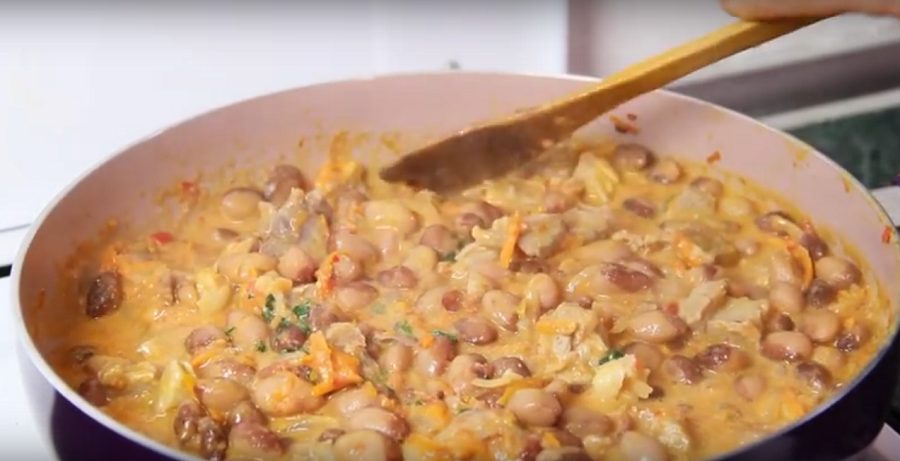 - Фасоль перекладываем в глубокую сковороду, добавляем к ней мясо, затем вливаем бульон и выкладываем подготовленную поджарку. Все перемешиваем. При необходимости добавляем соль, перец.
