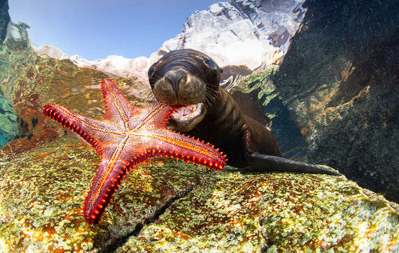 На конкурс подводной фотографии Underwater Photographer of the Year 2017 были поданы более 4500 работ из 67 стран мира. Каждая из этих фотографий – настоящий шедевр, который не только дарит удовольствие от просмотра, но и служит проводником в мир морских глубин. 1. Милейшее создание подводного мира дарит морскую звезду фотографу Францису Пересу (Francis Perez) 2. На днях организаторы престижного британского фотоконкурса Underwater Photographer of the Year объявили список финалистов. Главным призером стал французский фотограф Габриэль Баратью (Gabriel Barathieu) со снимком под названием «Танцующий осьминог». Автору удалось запечатлеть охоту осьминога в лагуне острова Майотта в Индийском океане. Талантливый любитель фотографии очень гордится тем, что в своей работе он смог создать впечатление большой глубины, ведь на самом деле герой его снимка намного меньше, чем кажется. 3. Ник Блейк (Nick Blake) и его фото подводного сенота на по