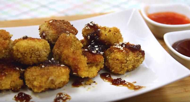 Для начала в панировочные сухари добавляем специи, немного солим, перчим и хорошо всё перемешиваем. Теперь разбиваем яйца и хорошо взбиваем их. Далее режем курицу на небольшие кусочки. Обваливаем каждый кусочек курицы в смеси из яиц и в сухарях. Наливаем масло в сковороду, выкладываем наши наггетсы и обжариваем их до золотистой корочки с каждой стороны на среднем огне. После того как наггетсы приготовились, выкладываем их на тарелочку и сервируем их. Я выложила наггетсы на красивую тарелку, полила их своим любимым соево-медовым соусосм и посыпала кунжутом, получается очень вкусно.