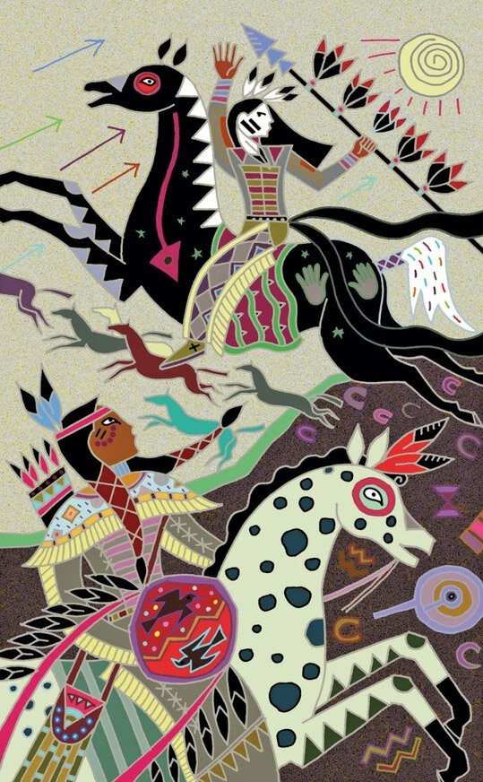 Кэролайн Смит в шестидесятые годы прошлого века была одним из ведущих европейских художников моды. Она сотрудничала с популярными тематическими журналами - такими, как Vogue и Cosmopolitan, Elle и Harpers, работала с известными домами моды. Сегодня ее работы входят в учебники, посвященные дизайну одежды и рисунку. Последние сорок лет Кэролайн занимается живописью и графикой, а источником ее вдохновения служит творчество неизвестных художников и скульпторов пещер Ласко, храмов Луксора и Мачи-Пичу, многочисленных ремесленников, сохранивших в своих работах древние символы и сигилы. "Каждый нарисованный знак, - говорит Кэролайн, - имел свое значение, каждый цвет обладал собственными смыслом и силой. Этот художественный язык, пронесенный сквозь время, будит мое воображение. Мы так мало знаем о наших предках, но можем приблизиться к ним, связаться с ними благодаря этим драгоценным сильным образам, дошедшим до нас из глубины веков". Иллюстрации к сборнику индейских сказок в об