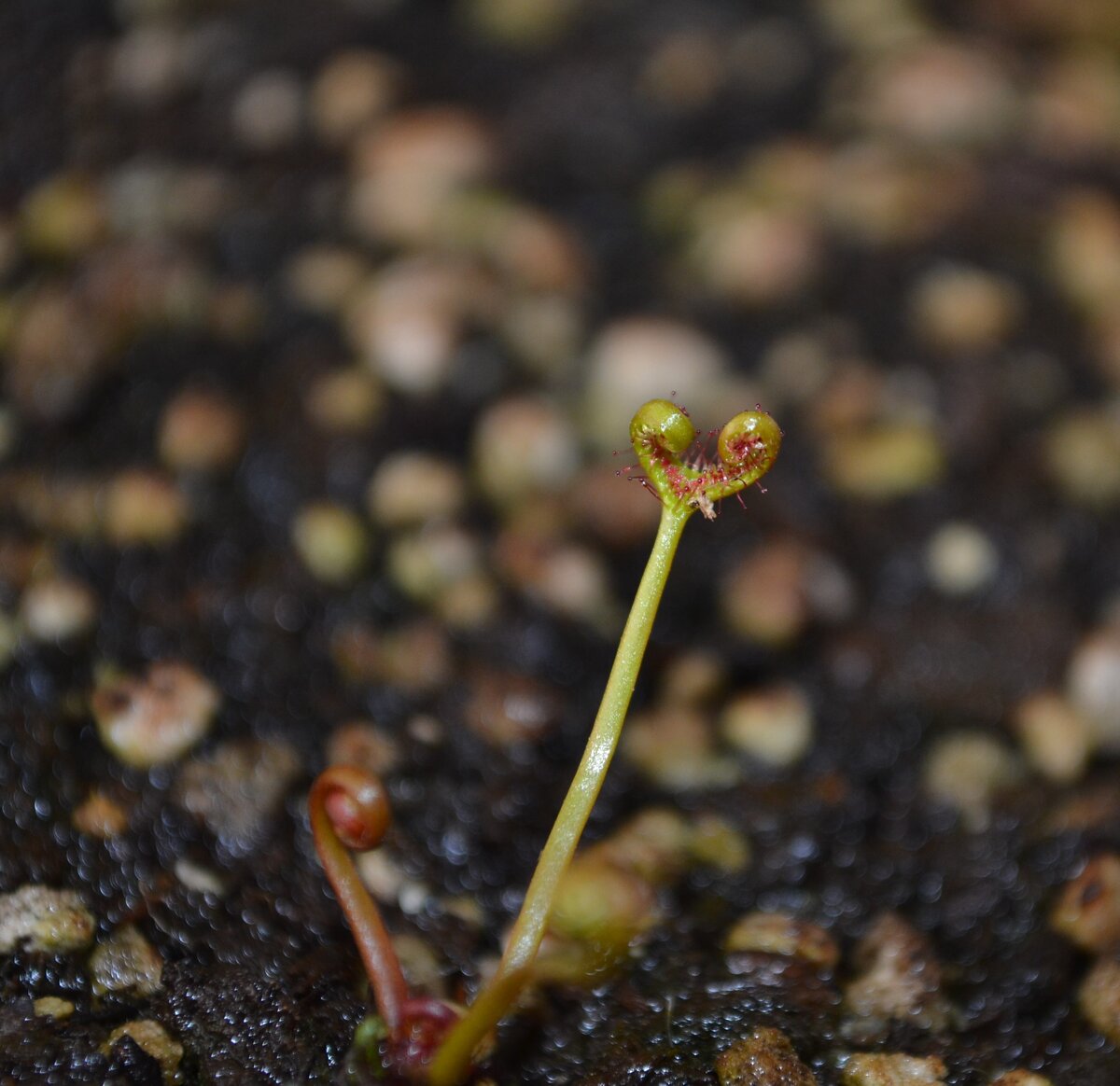 – Ой, а что это такое рогатое? - радостно подпрыгнула я и побежала фотографировать – Ну это росянка Бината... - лениво ответил мне муж. – А почему я ее раньше не видела? – Да она была на зимовке, там ничего не было видно. Нормально, да? Теперь вот вы будете думать, что она всегда такая, рогатая. Ну да ладно. Можете поверить на слово, что в процессе зимней спячки она красотой не блистала. Зато сейчас....ух какая! Зимой она была похожа на маленькие зеленые комочки. Которые весной начали расправляться... Расправлялись... расправлялись... И превратились вот в такую рогатую красавицу У Бинаты два длинных листа, усеянных тонкими ворсинками с липкими капельками на концах. Механизм ловли насекомых тот же, что и у всех других росянок: мошка садится на листок, попадает в липкую ловушку и выбраться уже не может. Листы бинаты не заворачиваются вокруг жертвы. Ее просто "обнимают" липкие волоски. Не знаю, что мешает мошкам немного пораскинуть мозгами (возможно, отсутствие мозгов), но если