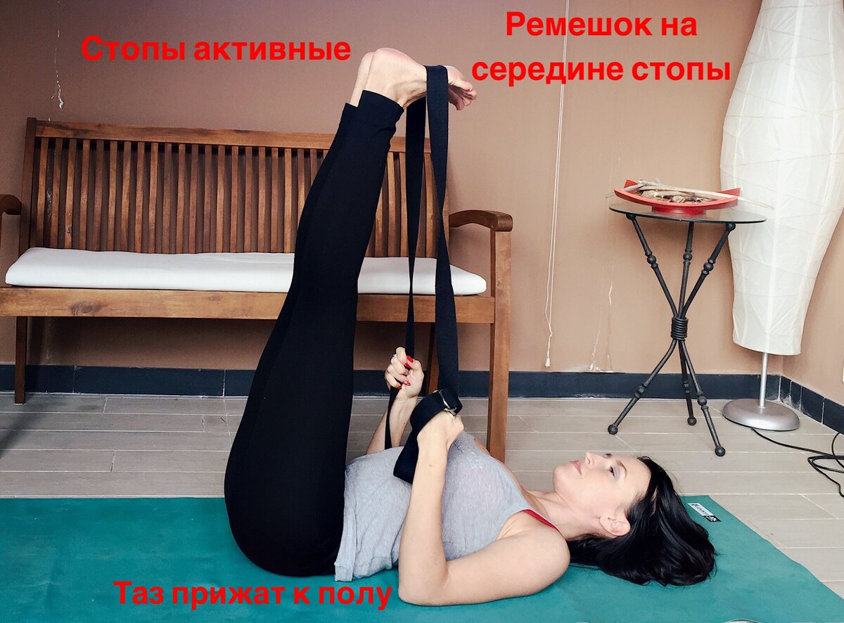 Начну рассказывать о положениях, в которых начинающим поможет ремешок для йоги. Вообще, ремешок - вещь очень полезная и нужная не только новичку, а даже и опытному практику. Ремешок не только даёт возможность выполнить позы не доступные начинающему, но и даёт комфорт и свободу, в которых можно и лучше почувствовать тело и остаться в позе дольше. Возможностей применения ремешка очень много. Начну сегодня с положения лёжа. Оно раскрывает тазобедренные суставы и растягивает мышцы ног. При правильном выполнении снимает напряжение с поясницы. В полном варианте это положения выполняются с захватом большого пальца ноги. Мы же будем использовать ремешок. Итак, положение когда обе ноги вытянуты вверх. Я бы выделила два варианта выполнения этой позы:
