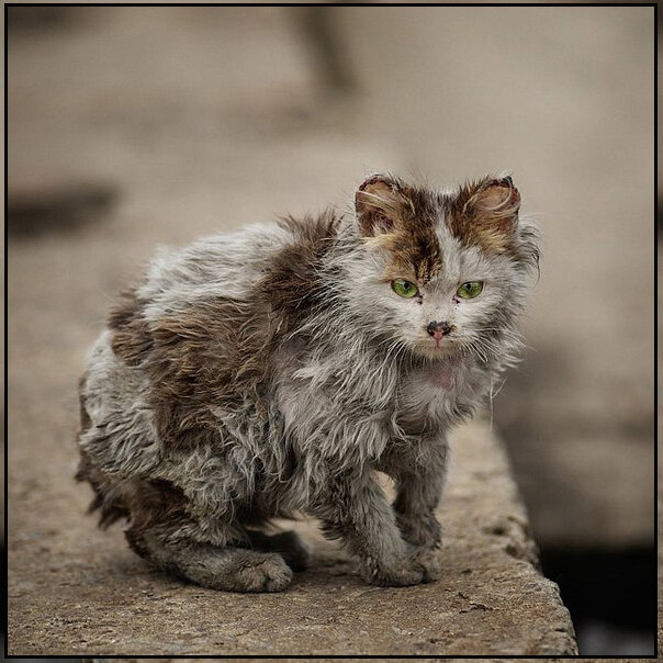 Всем привет, сегодняшняя история случилась в маленьком городе Южа Ивановской области. Бездомная кошка посреди зимних морозов родила под бетонной плитой всего лишь одного маленького зеленоглазого котенка. Новорожденный котенок изначально очень боялся людей и никогда не выходил вместе с мамой наружу, продолжая ее просто ждать и пытаться греться в опавшей сухой листве с тротуаров, которую ранее местные дворники просто забрасывали осенью под эти старые бетонные плиты. Через два с половиной месяца, уже в 20 числах марта случилось грустное, мама кошка просто ушла и больше не вернулась к своему котенку. Котенок тихо ждал свою маму целых два дня, при этом очень проголодался и ему пришлось превозмогая страх выйти на холодную улицу.Котенок еще день скитался по улице в поиске еды, но безуспешно. Он обессилев просто лег рядом с бордюром тротуара и не понятно, что бы с ним случилось, если его не увидела молодая девушка Анна, которая решила помочь бедному животному и забрала его к себе домой. Грязн