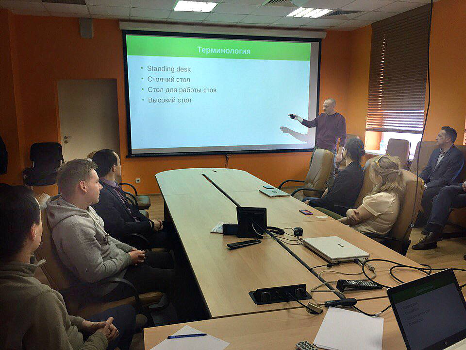 22 марта в офисе "Промсвязьбанка" состоялся внутренний meetup, где наш коллега, инженер-программист Андрей Бесчеревных рассказал, как год работал стоя, и, наконец, объяснил, зачем ему это было нужно. Не эксперимент Всё время Андрею приходилось отвечать на удивления коллег, проходящих мимо его рабочего места: «Почему ты стоишь? Это рабочее место в офисе — эксперимент? Ты кому-то проспорил? А что тебе за это дадут?» Но это не было челленджем. Попробовать работать стоя было абсолютно взвешенным решением, основанным на большой пользе для организма, который, как обнаружилось, ежедневно подолгу находится в сидячем состоянии. Оборудование Чтобы организовать рабочее место правильно, Андрею пришлось немного покреативить: сначала он просто взял и поставил на стол тумбочки. Спустя время соорудил специальные подставки из ножек и деревянных панелей. Дело в том, что для поддержания правильной осанки нужно располагать клавиатуру ниже монитора так, чтобы при печатании локти сгибались под углом