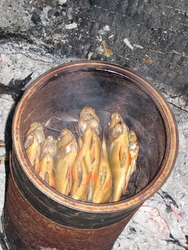 Продолжаю продвигать в массы идею домашнего копчения продуктов (см. мой рецепт «сыр горячего копчения»). Итак, как вы уже знаете, у меня есть замечательная коптильня, и я копчу на дому мясо, рыбу, сыр, овощи. Вratyury даже предлагал закоптить яйца, но все время об этом забываю. Юра, сделаю непременно и тут же сообщу. Но я отвлеклась. Продолжаю. Если раньше я занималась только горячим копчением, то сейчас освоила холодное(!). Идея полностью моя, исполнение – мужское. У моей коптильни есть клапан, на который навинчивается резиновый шланг. Шланг выбрасывается в форточку, в результате чего весь дым выходит на улицу, а не в квартиру. К этому нехитрому агрегату я придумала дополнительное устройство, позволяющее заниматься одновременно еще и холодным копчением. Устройство это следующее. Была куплена эмалированная кастрюля с крышкой и подставки для варки мантов (круглые пластины из нержавейки с дырочками, и подставки под них, позволяющие выстраивать сооружение в несколько рядов). Крышка на