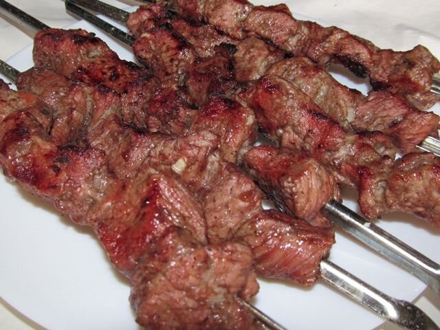 Этим рецептом я открываю очередной сезон пикников в нашей семье. Мариновать мясо в минеральной воде меня научил мясник, который снабжает меня. Оказывается это действительно очень просто, вкусно и при этом ещё и быстро. Мясо получается очень мягкое и нежное. Ингредиенты для шашлыка на минералке: килограмм мяса 500 гр. репчатого лука специи (молотый перец, кориандр, зира и д.р. – по вкусу) один литр минеральной воды с газом соль для готового шашлыка Приготовление шашлыка на минералке: Для шашлыка подходит любое мясо: свинина , говядина , баранина и т.д. У свинины берём окорок или шею, у говядины ленивые мышцы (спинка, поясница). Лук чистим, режем половинками колец. Довольно крупно. Складываем его в ёмкость, в которой будет мариноваться мясо. Хорошо мнём до появления сока. Можно не солить. В этом рецепте даже лучше не солить. Мясо режем на небольшие кусочки. Раньше я пытался как-то рекомендовать размер кусочка мяса для шашлыка. Сейчас пришёл к выводу, что каждый сам по наитию определяет