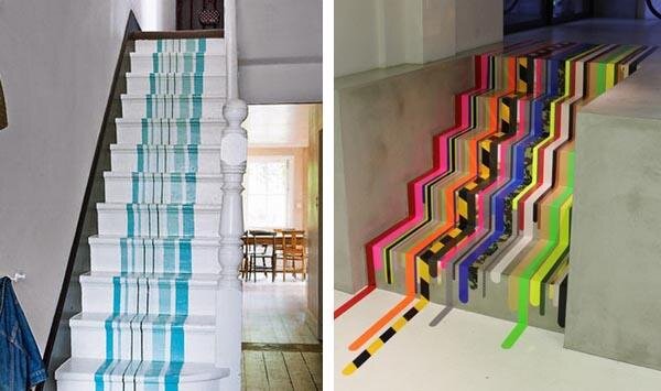 Один из простых способов добавить красок однотонной лестнице – полосы. Их можно нарисовать или сделать с помощью декоративной клейкой ленты. Хотите создать радужное настроение? Используйте всю цветовую палитру! Придерживаетесь строгого стиля? Тогда достаточно двух-трех оттенков.