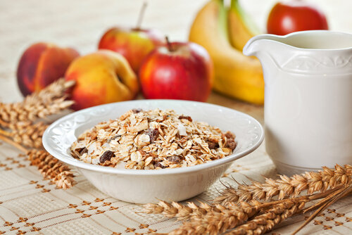 Утром добавляем в наши хлопья молоко или сливки, мед и орехи.