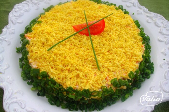 Слоёный салат из печени трески с соленым огурцом