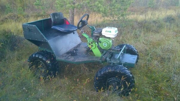 Мини-вездеход из мотоблока для поездок на охоту и рыбалку собрал народный умелец из сельской глубинки. Причем машина получилась полноприводной с колесной формулой 4х4, задний мост приводится в действие за счет цепной передачи, что в разы повышает проходимость по бездорожью Рама сварена из профиля 40 х 40 х 2 мм, колеса низкого давления от импортной модели квадроцикла, рама отделана пластиком для защиты от попадания влаги на металл. Двигатель 7 лошадиных сил от мотоблока, Рулевое управление от Отечественного автомобиля ВАЗ 2108. Ниже представлено фото заднего моста. Рама сварена из квадратного профиля, конструкцию можете внимательно рассмотреть на фото ниже. Колесо весит порядка семи килограмм. Двигатель от старенького мотоблока. Установка ДВС на раму мини-вездехода. Корпус машины отделан пластиком. Рулевое управление ВАЗ 2108 Водительское кресло из пластика. Испытания по бездорожью) Вариант мини-вездехода с колесной формулой 6 х 6 . Вездеход получился отличный, а что самое гла