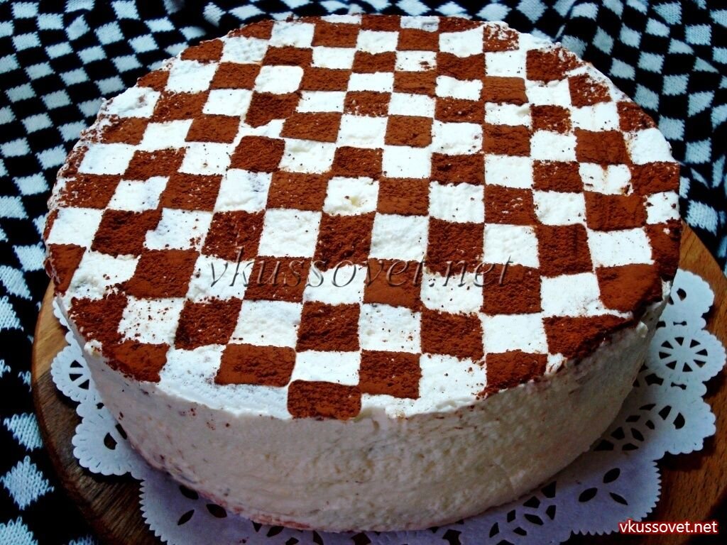 Торт в виде шахматной доски, рецепт приготовления в домашних условиях. В порционном кусочке торта шоколадные бисквитные квадраты чередуются с творожно-сливочным белым суфле в шахматном порядке, вызывая недоумение и желание разгадать, как же круглую форму можно выложить шахматным рисунком? Кроме привлекательно-загадочного вида "Шахматная доска" имеет невероятно нежное, ни с чем несравнимое пористое суфле с приятной лимонной кислинкой, влажный же бисквит насыщен устойчивым шоколадным вкусом. Приготовление торта растянуто во времени - готовому бисквиту нужно отлежаться не менее 4-х часов. Сборка же и застывание "Шахматной доски" займет еще часа 4.