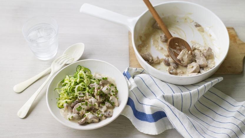 В каждой порции содержится 315 ккал, 29 г белков, 8,5 г углеводов (из которых 7 г Сахаров), 18 г жиров (из них 7 г насыщенных), 3,5 г волокна 0,3 г соли. Ингредиенты · 2 чайные ложки рапсового или подсолнечного масла · 1 средняя луковица, мелко нарезанная · 100г медальон постной свинины · 1 зубчик чеснока, раздавленный (по желанию) · 100г грибы (какие вам нравятся), крупно нарубленные · 100мл куриного бульона · 3 столовых ложек нежирной сметаны · 1 ст. л. нарезанного свежего шнитт-лука · соль и свежемолотый черный перец · 150г лапша courgetti или лапша из кабачка, для украшения Способ приготовления 1. Нагреть масло в небольшой сковороде. Добавьте лук и готовьте в течение 3-4 минут. 2. Добавить свинину, чеснок (если используете) и грибы и жарьте в течение 2-3 минут. 3. Влить бульон, накрыть крышкой и варить на сл