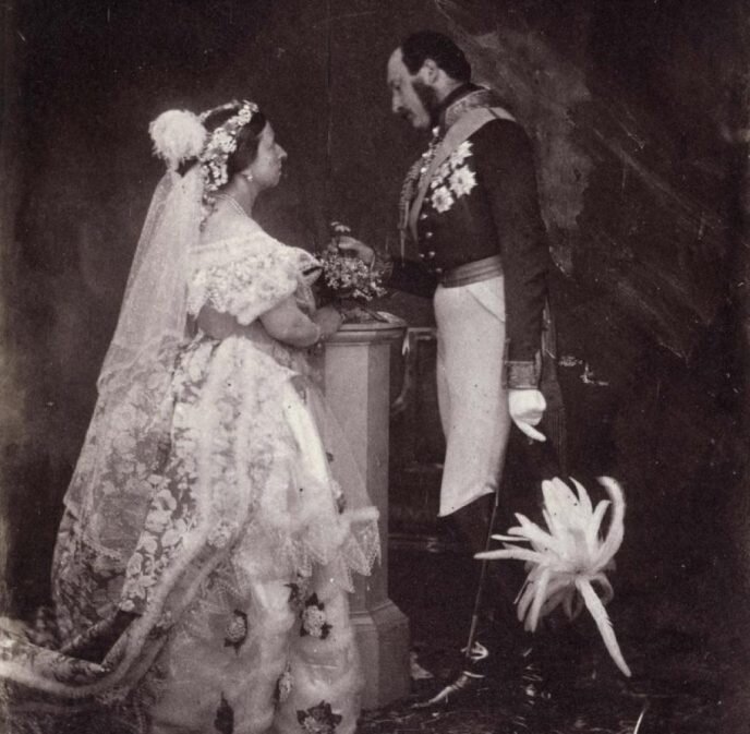 Традиция одевать белое платье на свадьбу, как и большинство других свадебных обычаев, зародилась во времена Викторианской эпохи. Её родоначальницей стала королева Виктория, которая вышла замуж за принца Альберта Саксен – Кобург – Готского. И, тем не менее, даже Виктория не сразу отважилась на такой шаг, ведь во времена ее правления среди невест был очень популярен красный цвет. Но, в конце концов, молодая августейшая особа, настояла на том, чтобы пойти к свадебному алтарю в белом платье из шелкового атласа. Королевский двор не сразу принял такое решение, полагая, что белый цвет слишком сдержанный для торжества такого масштаба. К тому же, Виктория наотрез отказалась одевать корону и мантию из горностая. Вместо этого, она отдала свое предпочтение изящному венку. И если поначалу, выбор королевы окружающие восприняли критически, то спустя несколько лет, английские леди стали называть белый цвет самым подходящим оттенком для невесты, который является символом чистоты и невинности, знаком т