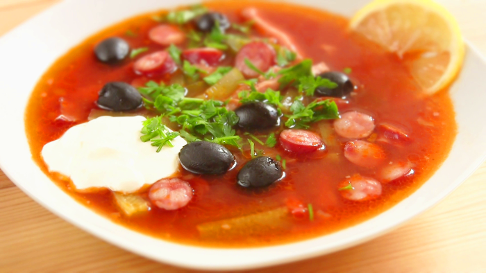 Предлагаю рецепт вкусной солянки с колбасой и оливками. Простой в приготовлении супчик и очень сытный. Ингредиенты: Как приготовить: Говядину помыть,зачистить от пленочек и положить в кастрюлю объемом 3 л,залить холодной водой . Поставить на средний огонь и довести до кипения.Снять пену ,положить очищенную луковицу и варить 1,5 – 2 часа при слабом кипении.За 10 минут до готовности положить лавровый лист и горошины душистого перца. Мясо вынуть,убрать специи,лук. Бульон процедить. Говядину отделить от костей и нарезать соломкой,а также нарезать соломкой колбасу и ветчину.Охотничьи колбаски нарезать колечками. Соленые (квашенные)огурцы нарезать соломкой.Выложить в небольшую кастрюльку,добавить 1-2 черпака бульона и проварить 5-7 минут. Лук мелко нарезать и обжарить на сливочном и растительном масле до мягкости. Положить томатную пасту,долить немного воды,дать закипеть. Выложить в кастрюлю с бульоном огурцы,зажарку ,мясо и копчености. Готовить 10-15 минут. Солянка готова!Накрыть