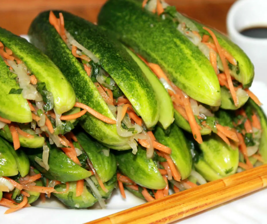 Это распространенная корейская закуска, которая подается как приложение к основному блюду. Закуска готовится очень быстро и может быть употреблена сразу после приготовления. Ингредиенты 7-8 огурцов 1 луковица 1 морковь 4-5 зубчиков чеснока Пучок зеленого лука 1 столовая ложка сушеной паприки 50 мл соевого соуса +10 гр. уксуса 100 мл воды 30 гр. соли 10 гр. сахара Приготовление Огурчики берем среднего размера, моем и надрезаем на 4 части не до конца. Посыпаем солью, так чтобы она попала и на внутреннюю поверхность огурца. Оставим на 15 минут. Лук репчатый нарежем полукольцами, а зеленый крупно нарубим, чеснок измельчим ножом , морковь соломкой. Эти овощи посыплем солью, сахаром, паприкой, польем соевым соусом и уксусом, хорошенько перемешаем. Огурцы промываем под проточной водой, чтобы убрать излишки соли, и щедро начиняем начинкой. Если остался маринад, выливаем его сверху на огурцы и оставляем на 10-12 часов. Самым нетерпеливым можно кушать сразу. Приятного аппетита! Не забывайте