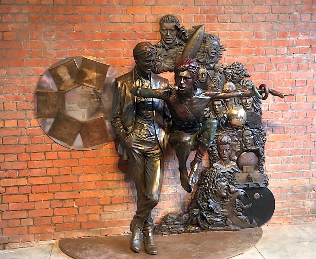 В Великобритании в центре города Эйлсбери установили бронзовый памятник Дэвиду Боуи под названием Земной посланник. Город Эйлсбери был выбран неслучайно. Здесь музыкант выпустил два своих альбома Hunky Dory в 1971 году и The Rise and Fall of Ziggy Stardust and the Spiders from Mars в 1972 году. Памятник Дэвиду Боуи представляет собой ансамбль из его сценических образов. На переднем плане певец представлен в наиболее известном его альтер эго Зигги Стардаста. Над фигурой были установлены динамики, которые каждый час будут воспроизводить песни Боуи. Деньги на создание памятника были собраны с помощью грантов. Также музыкальный промоутер Дэвид Стоппс через краудфандинг собрал 100 000 фунтов стерлингов. Помимо этого Стоппс подал петицию о переименовании Эйлсбери на Эйлсбоуи в честь артиста. Дэвид Боуи ушёл из жизни 10 января 2016 в возрасте 69 лет в Нью-Йорке от рака печени. На протяжении всей своей музыкальной деятельности он продал более 136 млн своих пластинок и вошел в десятку самых усп