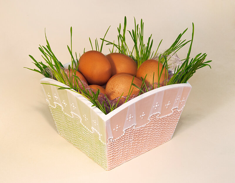 Традиционно на пасху красят, оплетают, обклеивают или иначе декорируют яйца. Для подачи на стол готовых кулинарных шедевров нужна соответствующая посуда. Предлагаю мастер-класс, в котором расписано, как из деревянной заготовки за несколько шагов сделать милую корзиночку с кружевами. Для декора корзиночек для пасхальных яиц с имитацией кружева нам понадобятся материалы: • грунт «Левкас»; • контурный гель (или простой контур); • краска «Акрил-Хобби Де Люкс» нескольких оттенков; • краска для росписи Белила Титановые. • из инструментов — синтетические кисти и наждачная бумага различной зернистости (240-320).