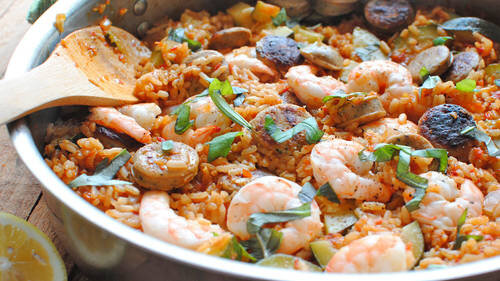 Это блюдо доставит вас прямо в Испанию. Классическое блюдо из риса с колбасой, креветками, кабачками и томатами прекрасно походит для полезного ужина.