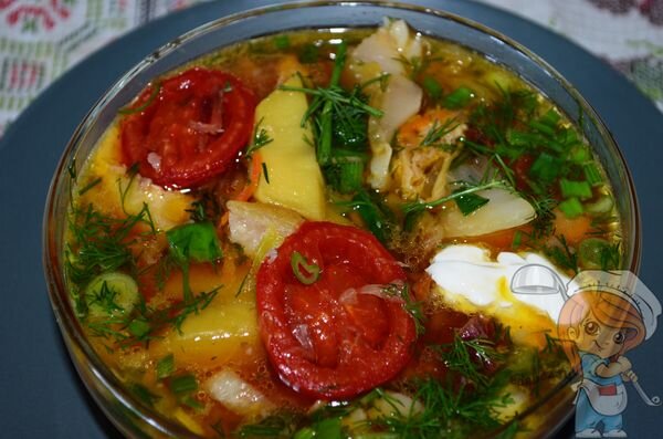 5. Минут через 20 овощи в кастрюле будут готовы. Выложите в неё заправку. Проварите летний борщ минут 10. Посолите его по вкусу. 6. Нарежьте всю