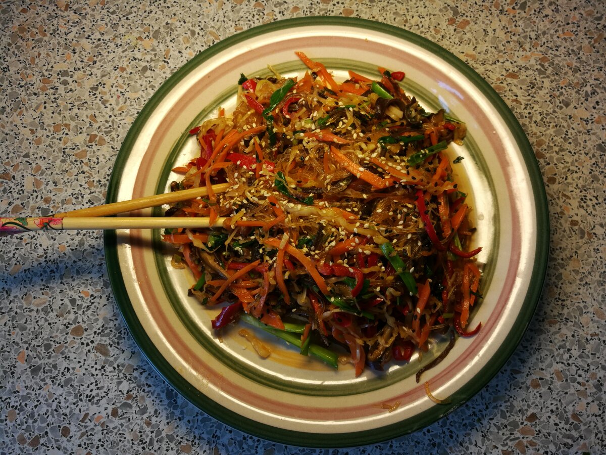 Фунчозу (стеклянную лапшу🍜) можно есть не только в салатах, но и в горячих блюдах! Китайское блюдо чоу мейн – это яичная лапша, обжаренная с овощами на очень большом огне. Очень популярно в Азии и США. Только вместо яичной лапши я беру фунчозу, а мясо заменяю на грибы. Получается легко для желудка и для совести, ни одна свинка здесь не пострадала. ⚜️Рецепт:⚜️ 2 блока фунчозы (в пачке их обычно по 4-5 блоков) 3 головки чеснока 1-2 чл нарезанного имбиря 2 стл порезанного лука 1-2 шт Чили перчика 1 средняя морковь 1 болгарский перец или перец рамиро Крупная горсть нарезанной капусты Горсть грибов на ваш выбор (у меня древесные грибы и шиитаке, можно взять шампиньоны) Зеленый лук Листья и стебли петрушки Кунжут ⚜️Соус:⚜️ 2 стл соевого соуса 1,5 стл кетчупа 1 чл сахара 1чл кунжутного масла 1 чл кукурузного крахмала Перец и соль по вкусу 1/4 стакана воды Фунчозу замочите в воде комнатной температуры на 10 минут. Нарежьте все овощи перед готовкой! Потому что обжариваться они будут