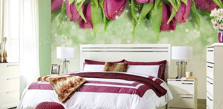Сиреневые цветы психологи особенно рекомендуют для оформления спальни, так как они успокаивают и способствуют расслаблению после насыщенного трудового дня. Но если нежные сиреневые тона кажутся вам скучноватыми, или они потеряются на фоне темной мебели, – смело выбирайте тюльпаны поярче! Яркие и эффектные фотообои с сиреневыми тюльпанами гарантированно преобразят ваш интерьер.