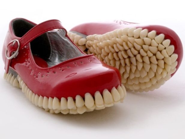 Дизайнерская обувь нередко поражает воображение смелыми идеями, но в последнее время все больше шокируют и вызывают недоумение. Смотрите, куда завела модельеров их безудержная фантазия. Самая необычная, смешная и прикольная обувь в нашей подборке. 1. Чем больше зубов, тем лучше Вероятно, такие туфли должны отпугивать уличных котов, но вот как отреагируют на них собаки? 2. Иду или плыву? Удобно ли? Но точно оригинально! 3. Копытами цокать теперь модно 4. Эротичные каблуки носить можно только после совершеннолетия Теперь мужчин будет интересовать самая нижняя часть женских ног. Ведь там можно увидеть все. 5. Сразу видно, к владельцу лучше не подходить 6. Удобно и практично. И по городу пройтись, и поплавать На какого рассчитывали дизайнеры, разрабатывая эту модель? 7. Не подходи ко мне, я колючая! Для поздних прогулок по темным переулкам колючие туфельки будут незаменимы. 8. В туфлях, как в банановом раю 9. Сразу видно, владелица этих туфелек кусается 10. Такие туфли дополнят сумочку