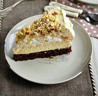 - Собираем торт. Вниз - шоколадно-ореховый корж, покройте половиной крема, сверху кладем меренговый корж и покрываем оставшимся кремом.