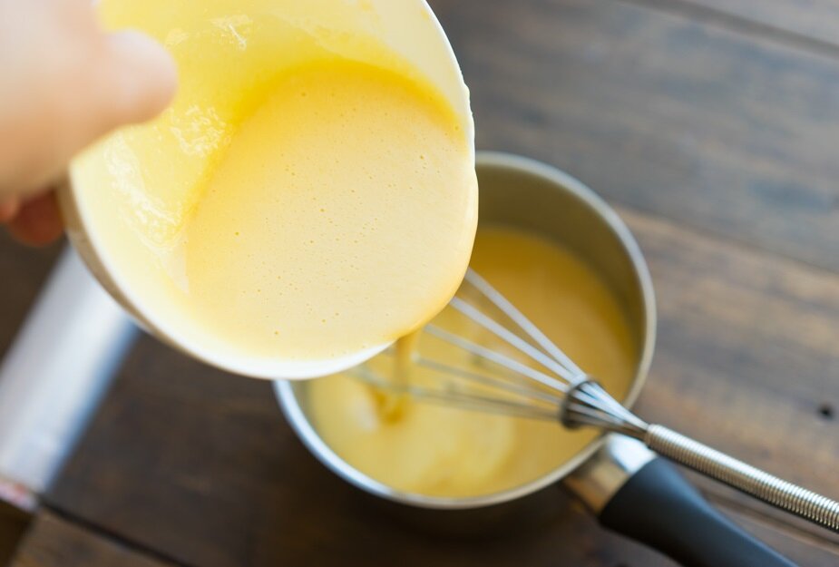 3. Перелить крем в кастрюлю и поместить на слабый огонь, варить, помешивая, до загустения.