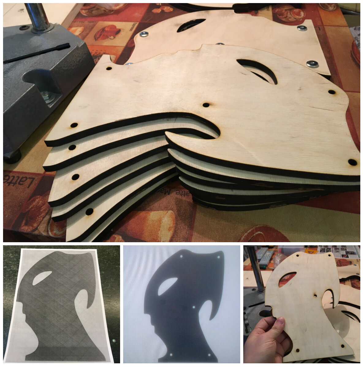 Задумка родилась спонтанно.В интернете нашел рисунок примерно того, что хотел видеть, перерисовал на компьютере, затем в coral и отдал на лазерную резку.Требовалось по расчетам 10 деталей из 8 мм фанеры с 5 отверстиями 6 мм: Также требовалось 4 детали из акрила, толщиной 2 мм: лицевые стороны пришлось рассверлить под диаметр шляпок декоративных гаек, так как я использовал для соединения шпильки: Далее нужно было покрасить, использовал лак. После высыхания я отшкурил мелкой наждачкой лицевые панели до легкого блеска и вот такого эффекта: Далее я по размерам основания основной конструкции изготовил подставку из трех слоев, в том числе слой акрила 5 мм: Изготовил плату, распаял, использовал пластиковый рассеиватель для би-линз: Скрепляем голову послойно: Красим и скрепляем подставку, предварительно выфрезеровав паз для провода: Ставим голову на подставку, подключаем блок питания. Провод и плату я закрепил с помощью термоклея. Подставка стоит рядом с компьютером, так как питание
