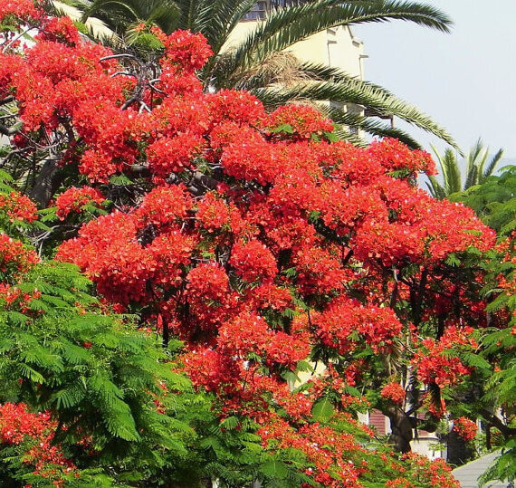 Цветы/плоды. Соцветия напоминают багряные цветы глицинии, о чем и свидетельствует происхождение американского названия «Scarlet Wisteria Тгее» («Дерево алой глицинии»). Впрочем, цветы действительно окрашены в фантастический ярко-красный цвет. Цветет с июля по осень. Плоды имеют четыре линейные выпуклости.