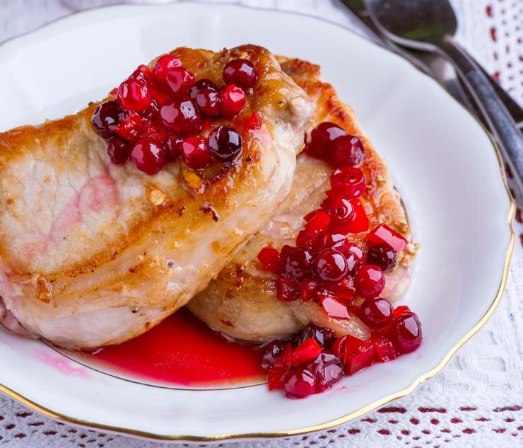 В ковше смешайте сахар и вино, прогрейте на медленном огне, помешивая до растворения сахара. Добавьте мелко нарезанный перец чили, готовьте 5 минут. Всыпьте в ковш клюкву, доведите соус до кипения, убавьте огонь до минимального, варите 10 минут. Мясо вымойте, обсушите и нарежьте порционными кусками. В сковороде разогрейте растительное масло, обжарьте мясо на сильном огне до золотистого цвета по 3-4 минуты с каждой стороны. Приправьте солью и перцем. Выложите мясо на тарелки, полейте острым клюквенным соусом. Время приготовления: 20 минут, 4 порции Продукты