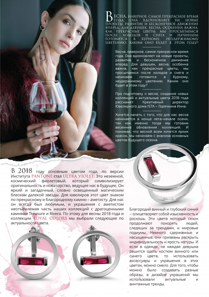 Весна, наверное, самое прекрасное время года. Она вдохновляет на новые проекты, развитие и бесконечное движение вперед. Для девушек, весна, особенна важна, как прекрасные цветы, мы просыпаемся после холодов и снега и начинаем готовится в бурному, неудержимому цветению. Каким оно будет в этом году? Про подготовку к весне, создание новых коллекций и актуальные цвета 2018 года расскажет Креативный директор Ювелирного дома ISTA – Горячкина Инна. Хочется начать с того, что для нас весна начинается в конце лета-начале осени, так как именно тогда мы готовим весенние обновления коллекций. И понимая, что весной всем хочется ярких красок, мы начинаем с анализа основных цветов будущего сезона. В 2018 году основным цветом года, по версии Института Pantone стал Ultra Violet. Это неземной, космический фиолетовый, который символизирует оригинальность и новаторство, ведущее нас в будущее. Он яркий и загадочный, словно освещенный магическим блеском далекой звезды. Для ювелиров этот цвет знаком по