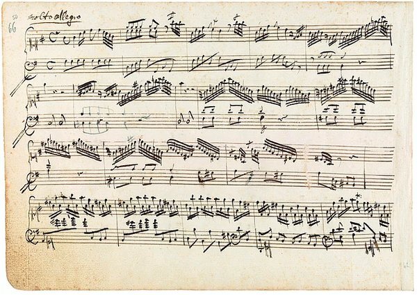 1. Вольфганг Амадей Моцарт Перед нами черновик, хотя в это трудно поверить. Ноты написаны очень чисто, точно и быстро. Ни единой помарки и ни следа кропотливого выписывания всех деталей! Можно брать рукопись и играть. 2. Людвиг ван Бетховен. Как в этом разбирались переписчики - одному Богу известно! Вот ещё одно доказательство. Бетховен был страстным поклонником Наполеона. В его честь он сочинил грандиозную Третью симфонию, и написал на титульном листе посвящение. По этой дыре на бумаге хорошо видно, в каком бешенстве он зачёркивал пером его имя, когда узнал, что тот предал идеалы революции и стал императором. 3. Фридерик Шопен Здесь надо мысленно убрать все желтые пятна времени, потому что автор в них не виноват. 4. Иоганн Себастьян Бах Это, скорее всего, не черновик, а набело переписанный автором текст. Но всё равно - очень наглядно. 5. Игорь Фёдорович Стравинский