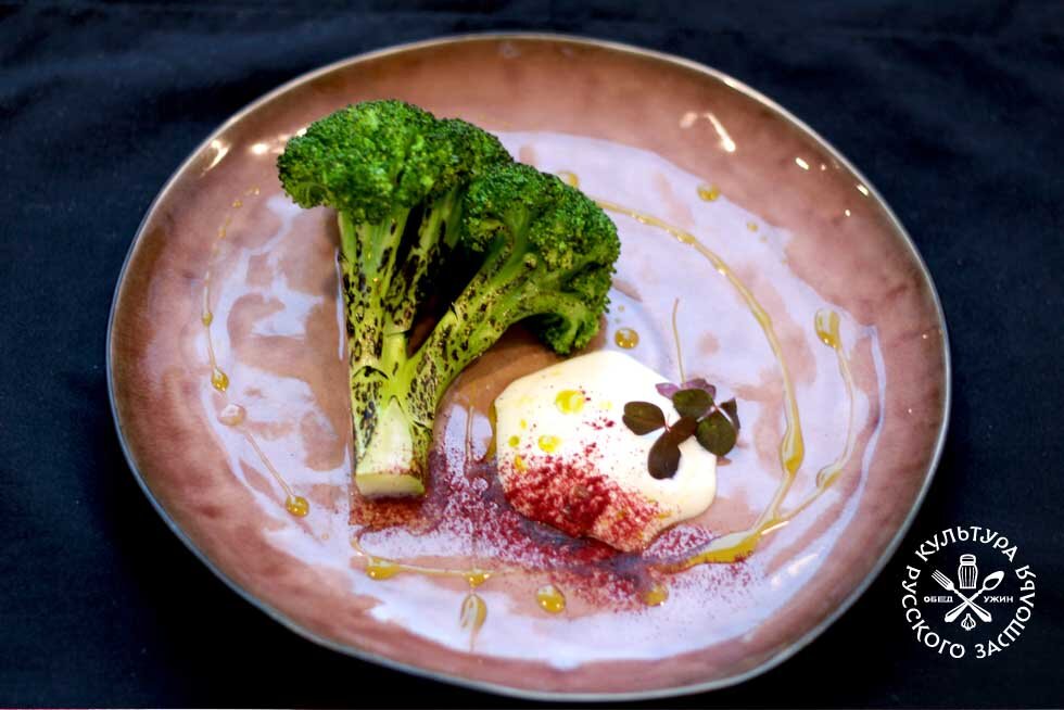 Рецепт. Капуста брокколи с кремом из топинамбура в сочетании с маслом из зеленого лука