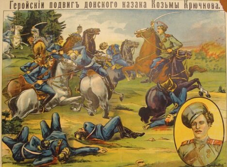 Козьма Крючков – донской казак, герой Первой мировой войны, прославившийся благодаря своей отваге и бесстрашию. Был награжден Георгиевским крестом 4-ой степени. Вошел в историю как смельчак, уничтоживший за один бой 22 немцев (по другим данным 27 немцев), в том числе офицера и унтер-офицера немецкого разъезда. Подвиг Козьмы Крючкова В 1911 году молодого вольного донского казака Козьму призвали в армию. Он попал в 3-ий казачий полк имени атамана, героя и завоевателя Сибири Ермака Тимофееча. К началу войны Крючков уже неоднократно отличился во время учебных боев и получил звание приказного, то есть стал младшим военачальником небольшого отряда. Козьма был настоящим героем своего времени, примером для современников. Однако многие документальные свидетельства его подвига были бесследно уничтожены. До нас дошел лишь скромный рассказ самого отважного казака и немногочисленные рассказы летописцев того времени. События происходили летом 1914 года, накануне начала военных действий на Восточном