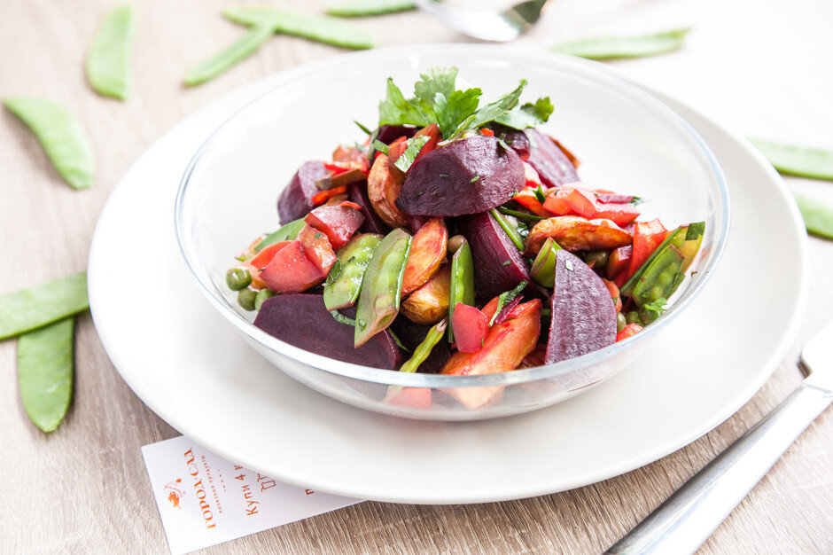 8. Петрушка 10 г Процесс приготовления: 1. Подготовка ингредиентов 2. Необходимо нарезать свеклу крупными дольками, полить оливковым малом, затем посыпать солью и запечь в духовке. 3. Картофель и морковь очистить, нарезать, добавить оливкового масла и тоже запечь. 4. Соединить в одной миске запеченные овощи. 5. Нужно добавить ошпаренный кипятком зеленый горошек и нарезанный соленый огурец. 6. Добавить соль, сахар, мелко нарезанную петрушку, немного оливкового масла и все хорошенько перемешать. 7. И вот наше заветное блюдо - винегрет готово! Приятного аппетита!