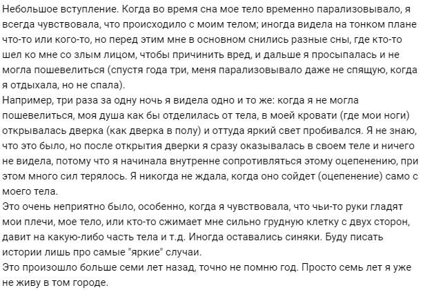 Небольшое вступление. Когда во время сна мое тело временно парализовывало, я всегда чувствовала, что происходило с моим телом...