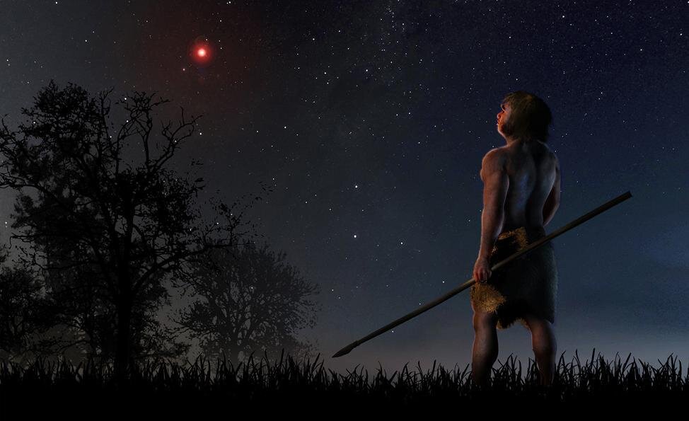И вот, теперь астрономы проанализировали около 340 объектов Солнечной системы с гиперболическими орбитами и пришли к выводу, что на траектории некоторых комет и астероидов повлияло прохождение звезды Шольца по облаку Оорта. Причём, если раньше считалось, что эта звезда приближалась на расстояние 0,8 световых лет к Солнцу, то последнее исследование показывает, что это расстояние составляло всего 0,6 световых лет! И наш далёкий предок, поднимая свою ещё малознающую башку вверх, наверное мог наблюдать новую звезду, как это показано на картинке.